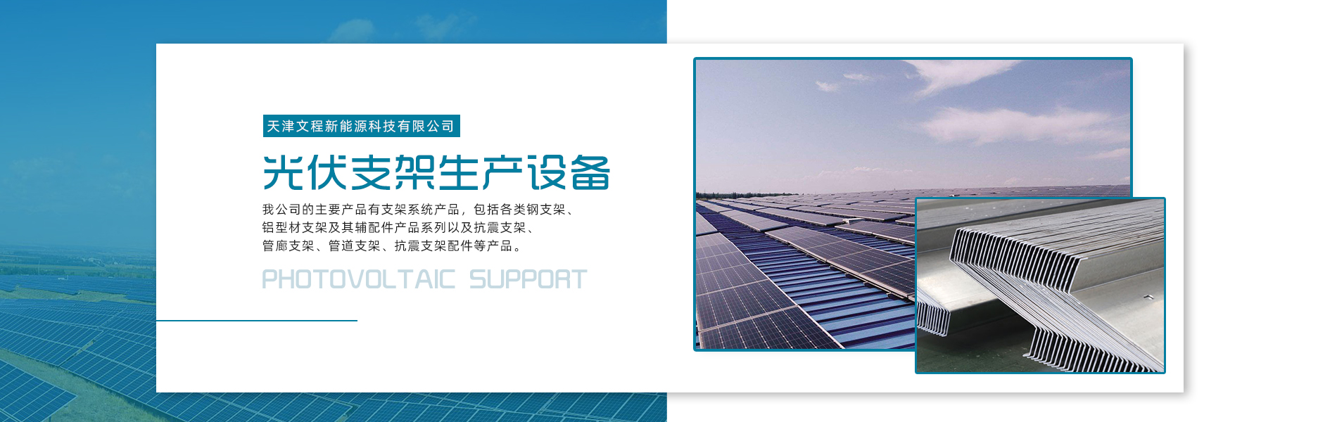 關于我們天津文程新能源科技有限公司成立于2021年,是專注于集中式、分布式、漁光互補和農光互補等清潔能源發電的綜合性企業 公司是集設計、研發、生產、制造為一體的綜合型企業。公司占地面積20000平方米,注冊資金5000萬元整。公司坐落于華北鋼鐵重鎮--大邱莊,距天津市區50公里、鄰104和205國道及京滬高速,交通十分便捷。 本公司擁有三個生產車間,其中兩個冷彎型鋼車間,一個鋅鋁鎂型鋼車間,擁有自動冷彎成型機10條,自動數控沖孔機10條以及焊接加工等設備。主要生產產品有:太陽能光伏支架、各種規格的C/Z/U型鋼、抗震支架、管廊支架及整套配件等。